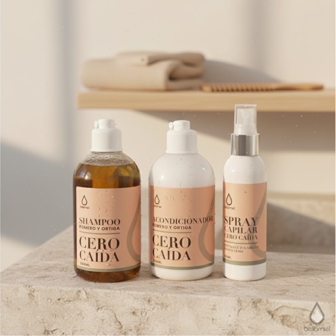 Este set reúne los tres productos clave de nuestra línea Cero Caída, formulados con romero, ortiga y miel, ideales para reducir la caída del cabello, equilibrar el cuero cabelludo y mejorar la salud capilar con el uso constante.